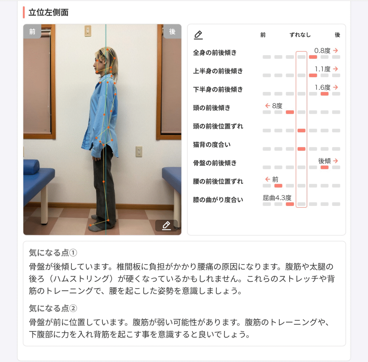 腸腰筋と腰痛の関係は非常に深く、健康における重要な要素です。腸腰筋は姿勢や歩行において重要な役割を持ち、腰椎や骨盤とのバランスを保つための筋肉です。乱れた姿勢や長時間のデスクワークなどが腸腰筋の状態を悪化させ、その結果、腰痛を引き起こす場合があります。 加えて、腸腰筋は股関節と連動し、太ももや上半身の動きとも密接に関係しています。これにより、筋力低下や緊張が生じ、坐骨神経痛や椎間板ヘルニアなどの症状が現れることもあります。したがって、腸腰筋を意識したケアが重要です。 改善策として、効果的なストレッチや運動を取り入れることで、腸腰筋の柔軟性を向上させ、腰痛を軽減することが可能です。その際、正しい〈位置〉や動作を意識し、緊張を和らげることが大切です。特に、身体の可動域を伸ばすエクササイズを行うことで、健康的な状態を維持し、日常生活の質を向上させることができるでしょう。姿勢に関しては当院でAI画像分析を行えるのでぜひ試してみてください。